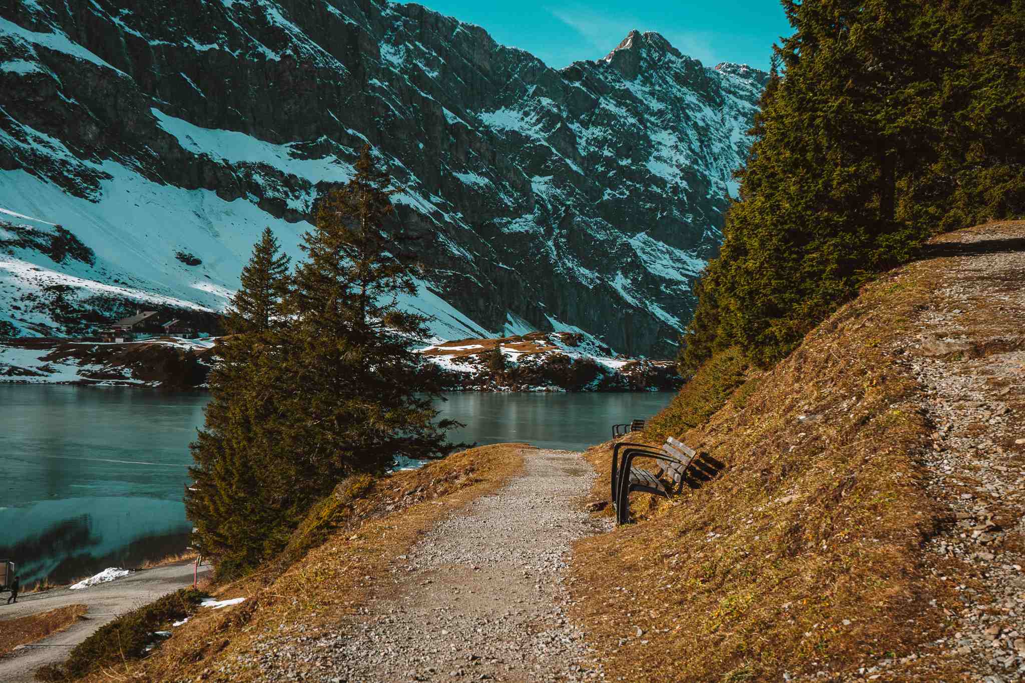 Titlis konden we helaas niet beklimmen — de gondel was under construction — dus stapten we een halte vroeger uit, bij Trübsee. Een oogverblindend (letterlijk) meer, verborgen tussen de besneeuwde toppen van het Titlisgebergte. Wandelen doe je in een klein uurtje rond het meer, met de optie om halfweg te voet af te dalen richting Engelberg. Die optie kozen wij.